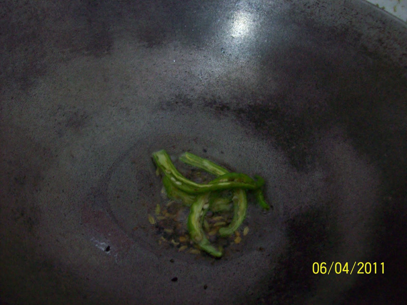 Step 3: As the whole seeds splutter throw in the split green chilly